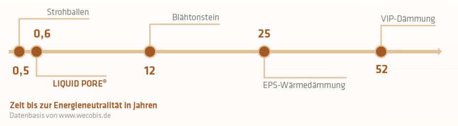 Liquid Pore spielt hier seine Vorteile mit der außergewöhnlichen Wärmespeicherfähigkeit voll aus. Sie bildet eine natürliche Barriere und Wärmeenergie kann nicht mehr ungehindert durch das Material diffundieren. Diese Betrachtung unter praxisorientierten Gesichtspunkten ist gerade für ökologische Baustoffe besonders wichtig, da die einfach Beurteilung nach der statisch erfassten Wärmeleitfähigkeit zu kurz greift und nicht die Eigenschaften des Materials wiederspiegelt.